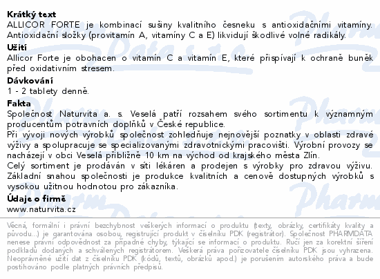 ALLICOR FORTE je kombinací sušiny kvalitního česneku s antioxidačními vitamíny. Antioxidační složky (provitamín A, vitamíny C a E) likvidují škodlivé volné radikály.