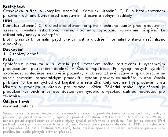 Česneková sušina a komplex vitamínů. Komplex vitamínů C, E s beta-karotenem přispívá k ochraně buněk před oxidativním stresem a volnými radikály.