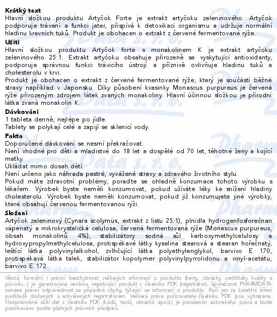 Hlavní složkou produktu Artyčok Forte je extrakt artyčoku zeleninového. Artyčok podporuje trávení a funkci jater, přispívá k detoxikaci organismu a udržuje normální hladinu krevních tuků. Produkt je obohacen o extrakt z červené fermentované rýže.