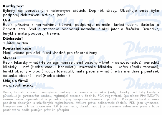 Bylinný čaj porcovaný v nálevových sáčcích. Doplněk stravy. Obsahuje směs bylin podporujících trávení a funkci jater.