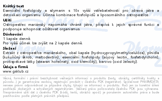 Esenciální fosfolipidy a silymarin s 10x vyšší vstřebatelností pro zdravá játra a detoxikaci organismu. Účinná kombinace fosfolipidů a liposomálního ostropestřce.