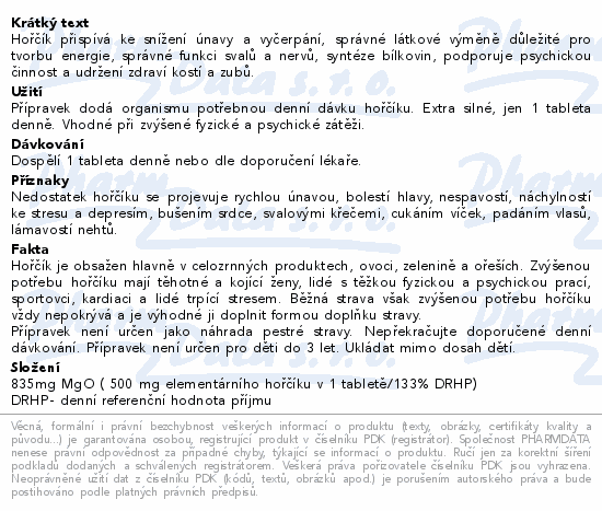 Hořčík přispívá ke snížení únavy a vyčerpání, správné látkové výměně důležité pro tvorbu energie, správné funkci svalů a nervů, syntéze bílkovin, podporuje psychickou činnost a udržení zdraví kostí a zubů.