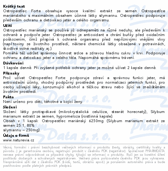Ostropestřec Forte obsahuje vysoce kvalitní extrakt ze semen Ostropestřce mariánského s maximálním obsahem účinné látky silymarinu. Ostropestřec podporuje především ochranu a detoxikaci jater a celého organismu.