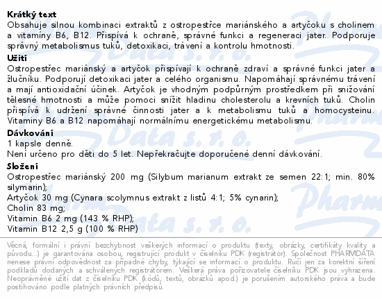 Obsahuje silnou kombinaci extraktů z ostropestřce mariánského a artyčoku s cholinem a vitamíny B6, B12. Přispívá k ochraně, správné funkci a regeneraci jater. Podporuje správný metabolismus tuků, detoxikaci, trávení a kontrolu hmotnosti.
