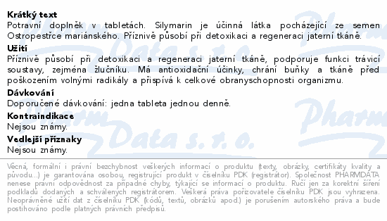 Potravní doplněk v tabletách. Silymarin je účinná látka pocházející ze semen Ostropestřce mariánského. Příznivě působí při detoxikaci a regeneraci jaterní tkáně.