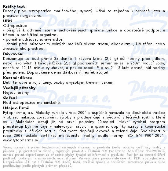 Drcený plod ostropestřce mariánského, sypaný. Užívá se zejména k ochraně jater a pročištění organizmu.