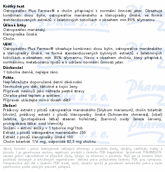 Ostropestřec Plus Farmax® a cholin přispívající k normální činnosti jater. Obsahuje kombinaci dvou bylin, ostropestřce mariánského a klanoprašky čínské, ve formě standardizovaných extraktů v želatinových tobolkách s obsahem min.80% silymarinu.