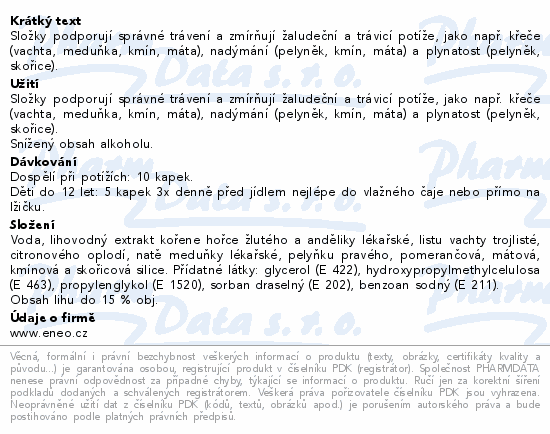 Doplněk stravy. Složky doplňku podporují přirozenou funkci trávicí soustavy. Snížený obsah alkoholu.