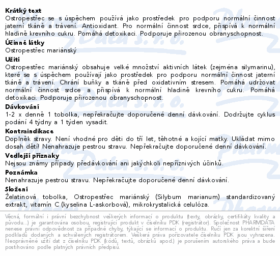 Ostropestřec se s úspěchem používá jako prostředek pro podporu normální činnost jaterní tkáně a trávení. Antioxidant. Pro normální činnost srdce, přispívá k normální hladině krevního cukru. Pomáhá detoxikaci. Podporuje přirozenou obranyschopnost.