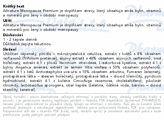 Allnature Menopauza Premium je doplňkem stravy, který obsahuje směs bylin, vitaminů a minerálů pro ženy v období menopauzy.