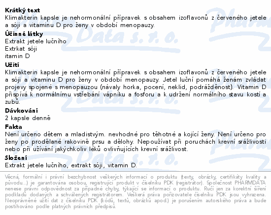 Klimakterin kapsle je nehormonální přípravek s obsahem izoflavonů z červeného jetele a sóji a vitaminu D pro ženy v období menopauzy.
