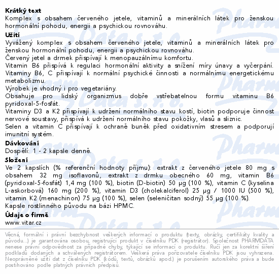 Komplex s obsahem červeného jetele, vitaminů a minerálních látek pro ženskou hormonální pohodu, energii a psychickou rovnováhu.