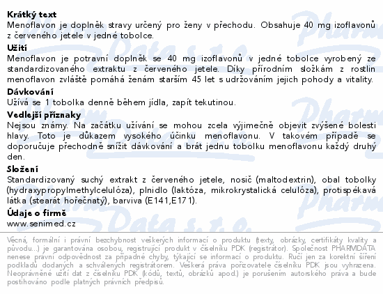 Doporučené dávkování: Stabilní účinky se dostavují při pravidelném užívání. Obvykle se užívá 1 tobolka menoflavonu (40 mg) denně. V případě větších potíží je možné denní dávku zvýšit na 2 tobolky denně (nebo 1 tobolku menoflavon Forte - 80 mg). Později je možné dávku opět snížit na 1 tobolku menoflavonu (40 mg) každý den.