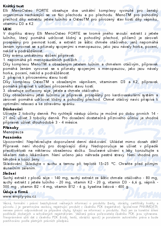 Elli MenoOsteo FORTE obsahuje dva unikátní komplexy vyvinuté pro ženský organizmus nacházející se ve fázi přechodu a po přechodu. MenoTM pro pohodlný přechod díky extraktu jetele lučního a OsteoTM pro přirozený stav kostí díky vápníku, vitaminu D3 a K2.
