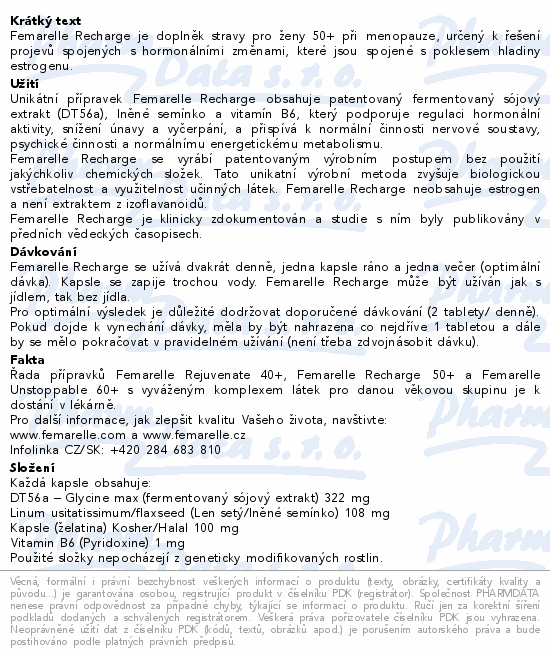 Femarelle® Recharge je doplněk stravy pro ženy 50+ při menopauze, určený k řešení projevů spojených s hormonálními změnami, které jsou spojené s poklesem hladiny estrogenu.
