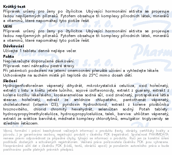 Fytofem harmony+control tbl. 90 je doplněk stravy určený pro ženy v období menopauzy a perimenopauzy. Obsahuje kombinaci rostlinných extraktů, vitamínů a minerálů, které přispívají k celkové pohodě ženy a pomáhají lépe zvládat přirozené hormonální změny v tomto období.