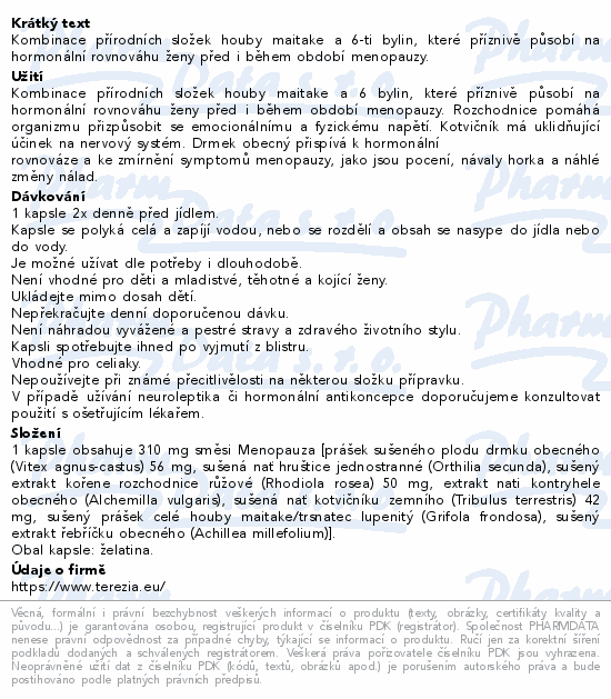 Kombinace přírodních složek houby maitake a 6-ti bylin, které příznivě působí na hormonální rovnováhu ženy před i během období menopauzy.