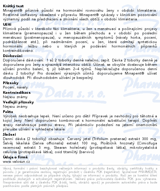 Minapent® příznivě působí na hormonální rovnováhu ženy v období klimakteria. Rostlinné izoflavony obsažené v přípravku Minapent® vykázaly v klinickém pozorování významný podíl na předcházení a zmírnění všech obtíží v období klimakteria.