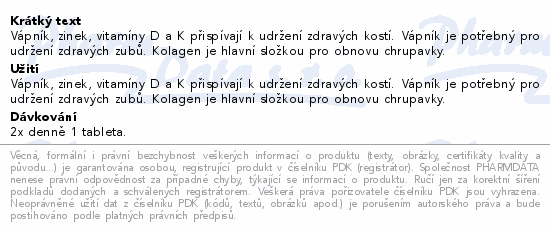 Vápník, zinek, vitamíny D a K přispívají k udržení zdravých kostí. Vápník je potřebný pro udržení zdravých zubů. Kolagen je hlavní složkou pro obnovu chrupavky.