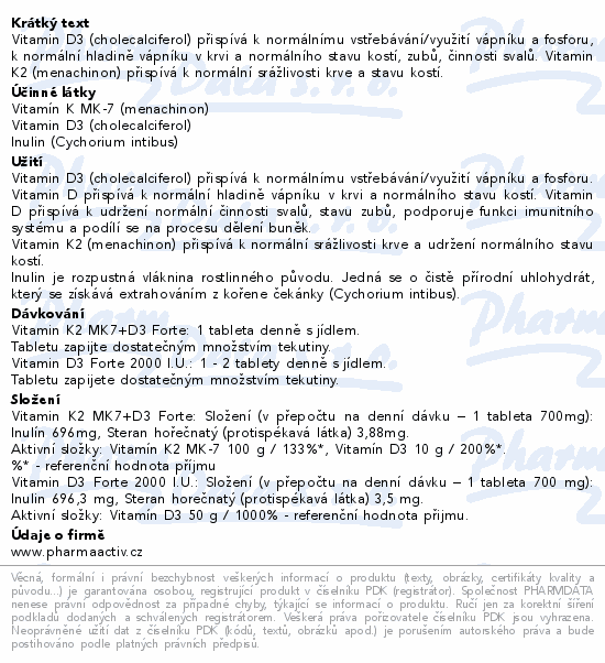 Vitamin D3 (cholecalciferol) přispívá k normálnímu vstřebávání/využití vápníku a fosforu, k normální hladině vápníku v krvi a normálního stavu kostí, zubů, činnosti svalů. Vitamin K2 (menachinon) přispívá k normální srážlivosti krve a stavu kostí.