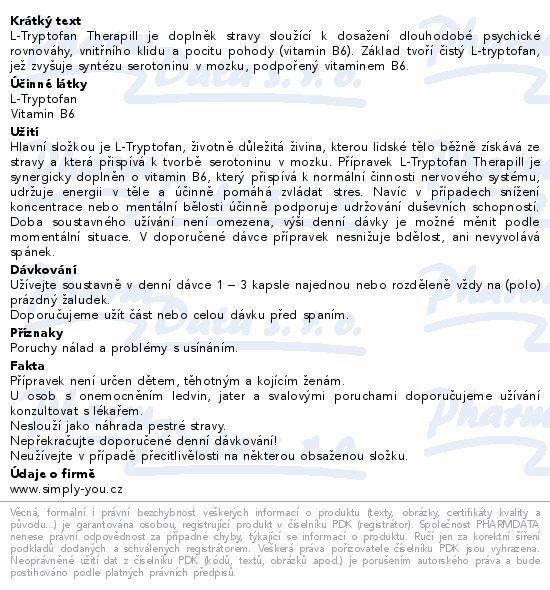 L-Tryptofan Therapill je doplněk stravy sloužící k dosažení dlouhodobé psychické rovnováhy, vnitřního klidu a pocitu pohody (vitamin B6). Základ tvoří čistý L-tryptofan, jež zvyšuje syntézu serotoninu v mozku, podpořený vitaminem B6.