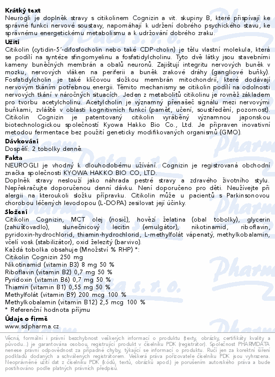 Neurogli je doplněk stravy s citikolinem Cognizin a vit. skupiny B, které přispívají ke správné funkci nervové soustavy, napomáhají k udržení dobrého psychického stavu, ke správnému energetickému metabolismu a k udržování dobrého zraku.