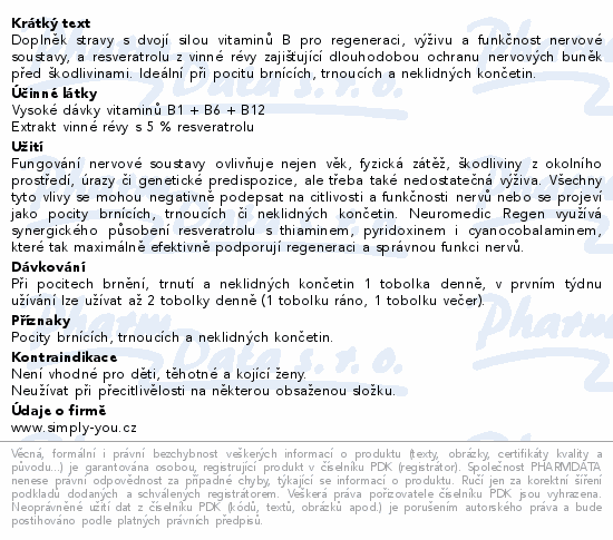 Doplněk stravy s dvojí silou vitaminů B pro regeneraci, výživu a funkčnost nervové soustavy, a resveratrolu z vinné révy zajišťující dlouhodobou ochranu nervových buněk před škodlivinami. Ideální při pocitu brnících, trnoucích a neklidných končetin.
