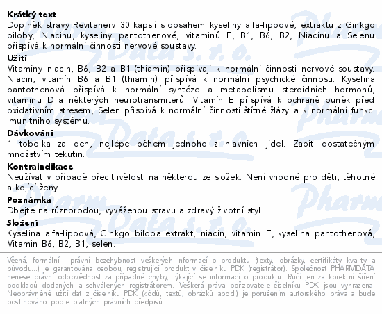 Doplněk stravy Revitanerv 30 kapslí s obsahem kyseliny alfa-lipoové, extraktu z Ginkgo biloby, Niacinu, kyseliny pantothenové, vitaminů E, B1, B6, B2, Niacinu a Selenu přispívá k normální činnosti nervové soustavy.