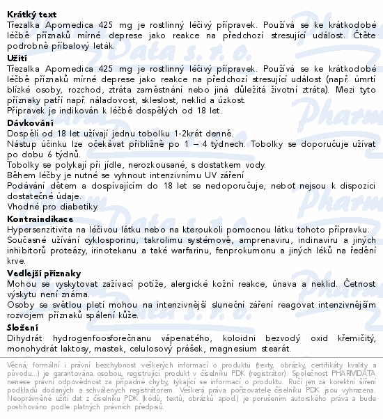 Třezalka Apomedica 425 mg je rostlinný léčivý přípravek. Používá se ke krátkodobé léčbě příznaků mírné deprese jako reakce na předchozí stresující událost. Čtěte pozorně příbalový leták.
