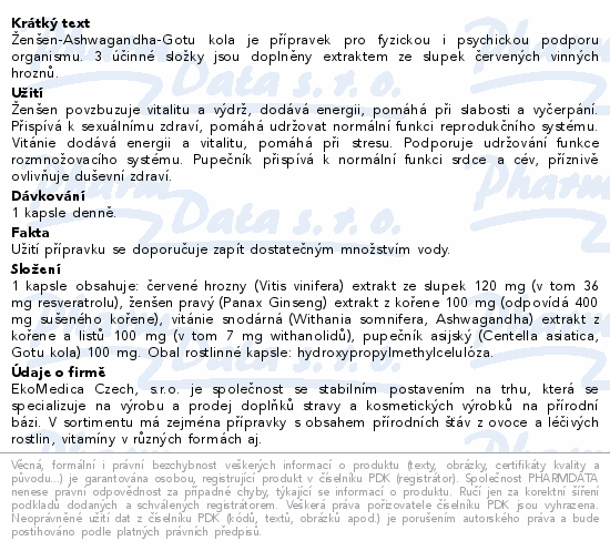 Ženšen-Ashwagandha-Gotu kola je přípravek pro fyzickou i psychickou podporu organismu. 3 účinné složky jsou doplněny extraktem ze slupek červených vinných hroznů.