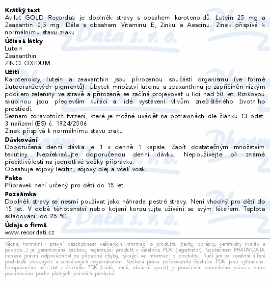 Avilut GOLD Recordati je doplněk stravy s obsahem karotenoidů: Lutein 25 mg a Zeaxantin 0,5 mg. Dále s obsahem Vitaminu E, Zinku a Aescinu. Zinek přispívá k normálnímu stavu zraku.