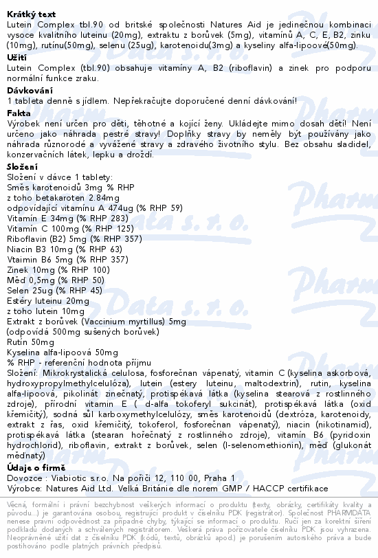 Lutein Complex tbl.90 od britské společnosti Natures Aid je jedinečnou kombinaci vysoce kvalitního luteinu (20mg), extraktu z borůvek (5mg), vitamínů A, C, E, B2, zinku (10mg), rutínu(50mg), selenu (25ug), karotenoidu(3mg) a kyseliny alfa-lipoové(50mg).