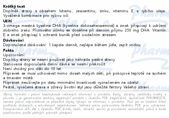 Doplněk stravy s obsahem luteinu, zeaxantinu, zinku, vitaminu E a rybího oleje. Vyvážená kombinace pro výživu očí.