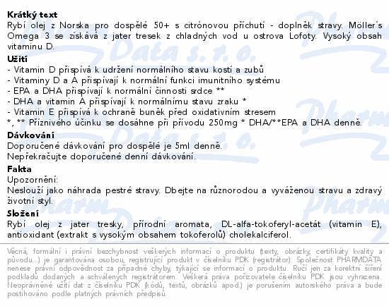 Rybí olej z Norska pro dospělé 50+ s citrónovou příchutí - doplněk stravy. Möller´s Omega 3 se získává z jater tresek z chladných vod u ostrova Lofoty. Vysoký obsah vitaminu D.