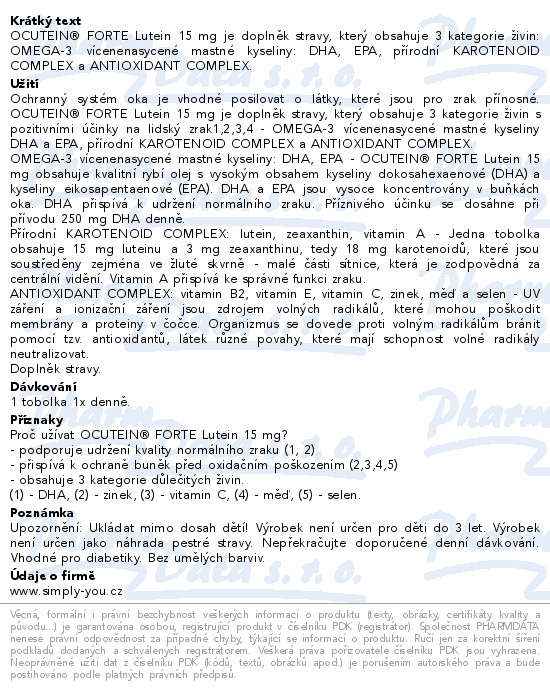 OCUTEIN® FORTE Lutein 15 mg je doplněk stravy, který obsahuje 3 kategorie živin: OMEGA-3 vícenenasycené mastné kyseliny: DHA, EPA, přírodní KAROTENOID COMPLEX a ANTIOXIDANT COMPLEX.