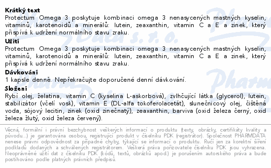 Protectum Omega 3 poskytuje kombinaci omega 3 nenasycených mastných kyselin, vitaminů, karotenoidů a minerálů: lutein, zeaxanthin, vitamin C a E a zinek, který přispívá k udržení normálního stavu zraku.
