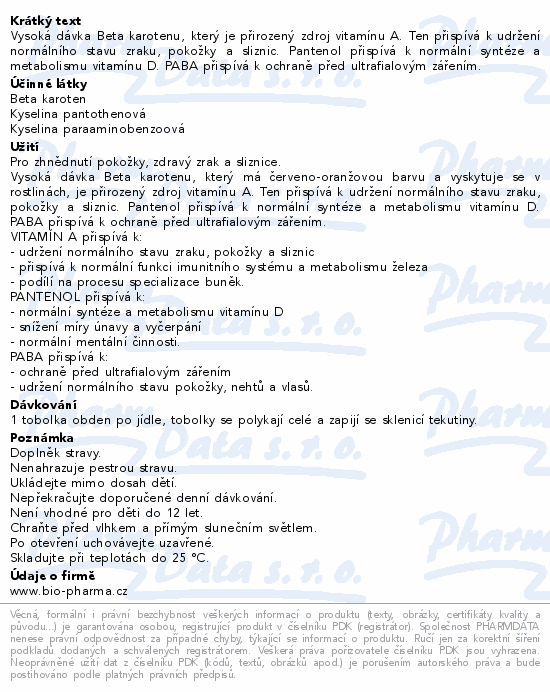 Vysoká dávka Beta karotenu, který je přirozený zdroj vitamínu A. Ten přispívá k udržení normálního stavu zraku, pokožky a sliznic. Pantenol přispívá k normální syntéze a metabolismu vitamínu D. PABA přispívá k ochraně před ultrafialovým zářením.