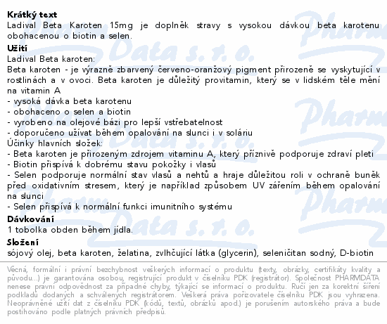 Ladival Beta Karoten 15mg je doplněk stravy s vysokou dávkou beta karotenu obohacenou o biotin a selen.