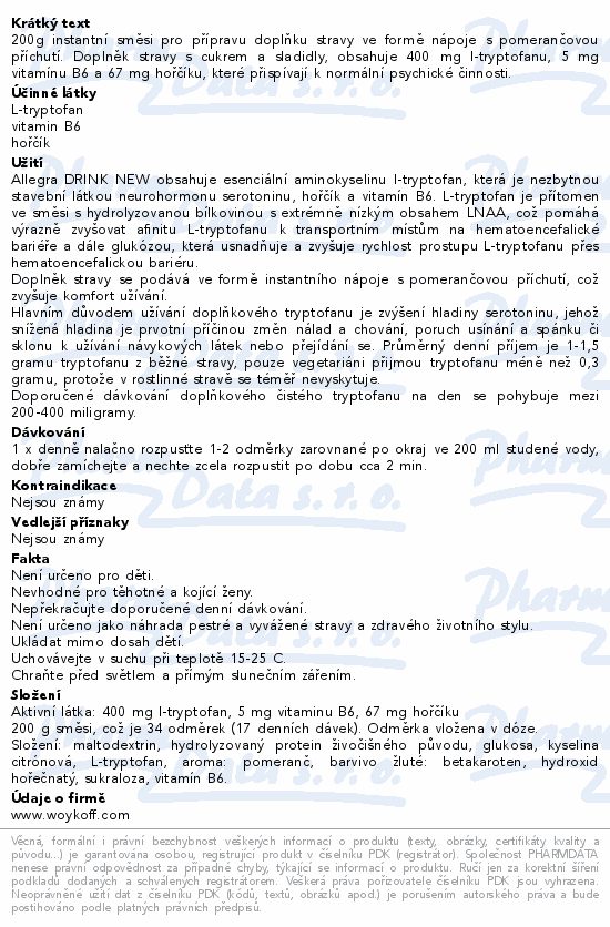 200g instantní směsi pro přípravu doplňku stravy ve formě nápoje s pomerančovou příchutí. Doplněk stravy s cukrem a sladidly, obsahuje 400 mg l-tryptofanu, 5 mg vitamínu B6 a 67 mg hořčíku, které přispívají k normální psychické činnosti.