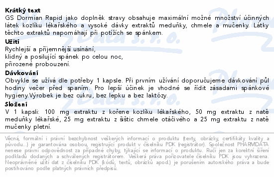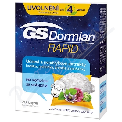 GS Dormian Rapid jako doplněk stravy obsahuje maximální možné množství účinných látek kozlíku lékařského a vysoké dávky extraktů meduňky, chmele a mučenky. Látky těchto extraktů napomáhají při potížích se spánkem.
