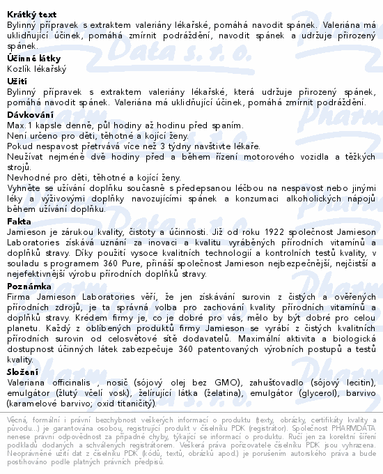 Bylinný přípravek s extraktem valeriány lékařské, pomáhá navodit spánek. Valeriána má uklidňující účinek, pomáhá zmírnit podráždění, navodit spánek a udržuje přirozený spánek.