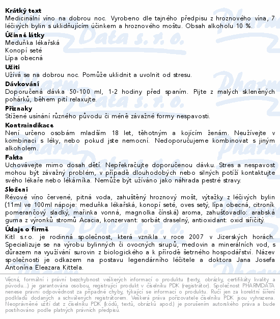 Medicinální víno na dobrou noc. Vyrobeno dle tajného předpisu z hroznového vína, 7 léčivých bylin s uklidňujícím účinkem a hroznového moštu. Obsah alkoholu 10 %. K dostání ve variantách Zlatý a Rudý, které se liší chutí, z hlediska účinku jsou stejné.