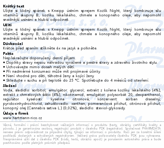Užijte si klidný spánek s Kneipp ústním sprejem Kozlík Night, který kombinuje sílu vitamínů skupiny B, kozlíku lékařského, chmele a konopného oleje, aby napomohl snadnější usínání a hlubší odpočinek.