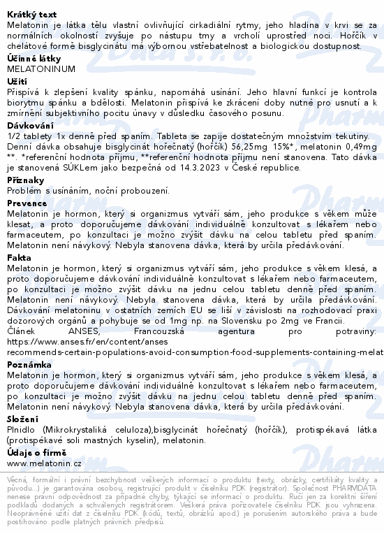 Melatonin, neboli "hormon spánku", je látka tělu vlastní, která přirozeně ovlivňuje cirkadiánní rytmy (cyklus spánek-bdění). Jeho hladina se za normálních okolností zvyšuje po nástupu tmy a vrcholí uprostřed noci. Přispívá ke zkrácení doby nutné pro usnutí. Melatonin není návykový.