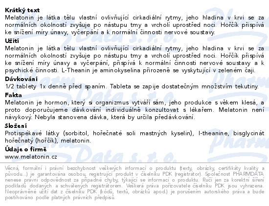 Melatonin je látka tělu vlastní ovlivňující cirkadiální rytmy, jeho hladina v krvi se za normálních okolností zvyšuje po nástupu tmy a vrcholí uprostřed noci. Hořčík přispívá ke snížení míry únavy, vyčerpání a k normální činnosti nervové soustavy.