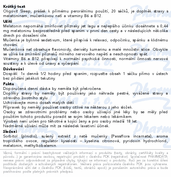 Oligovit Sleep, prášek k přímému perorálnímu použití, 20 sáčků, je doplněk stravy s melatoninem, mučenkovou naťí a vitaminy B6 a B12.
