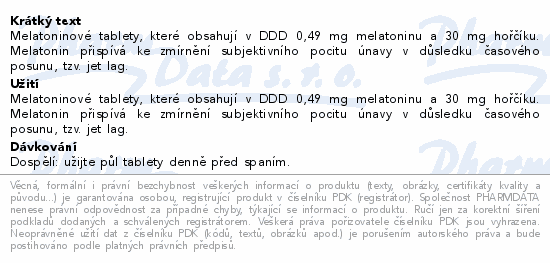 Melatoninové tablety, které obsahují v DDD 0,49 mg melatoninu a 30 mg hořčíku. Melatonin přispívá ke zmírnění subjektivního pocitu únavy v důsledku časového posunu, tzv. jet lag.