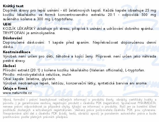 Doplněk stravy pro lepší usínání - 60 želatinových kapslí. Každá kapsle obsahuje 25 mg kozlíku lékařského ve formě koncentrovaného extraktu 20:1 - odpovídá 500 mg sušeného kořene a 300 mg L-tryptofanu.