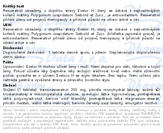 Resveratrol obsažený v doplňku stravy Evelor H, který se získává z nejkvalitnějších kořenů rostliny Polygonum cuspidatum Siebold et Zucc., je antioxidantem. Resveratrol přináší úlevu od projevů menopauzy a příznivě působí na zdraví srdce a cév.