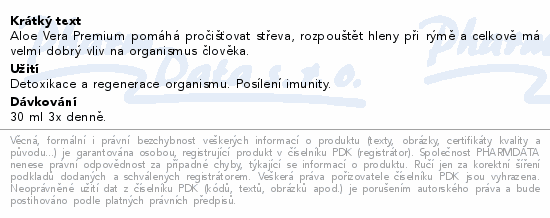 Aloe Vera Premium pomáhá pročišťovat střeva, rozpouštět hleny při rýmě a celkově má velmi dobrý vliv na organismus člověka.